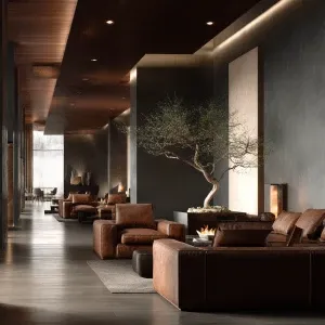 «Design a luxurious modern lounge interior with ten plush leather...»