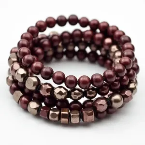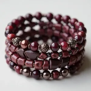 «"A multi-strand bracelet combining burgundy beads with metallic...»