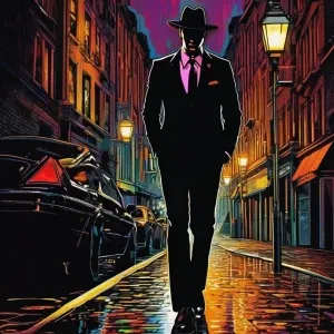 «A shadowy figure in a sleek black suit stands in a dimly lit all...»