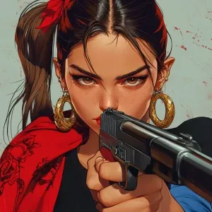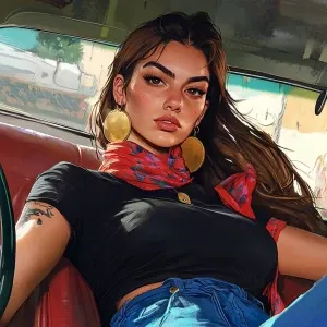 «Lucia from GTA, a girl with brown hair, thick eyebrows, pumped u...»