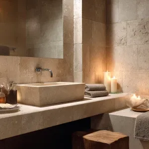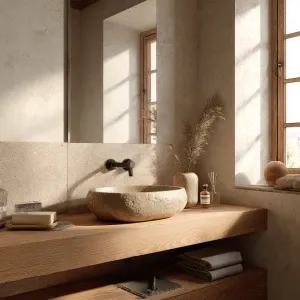 «Create a sophisticated spa-like atmosphere in a compact beige-to...»