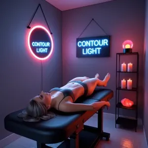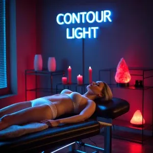 «Generate an image of a middle-aged woman lying on a black massag...»
