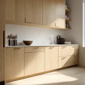 «“Japandi kitchen with beige oak cabinets, minimal hardware, micr...»