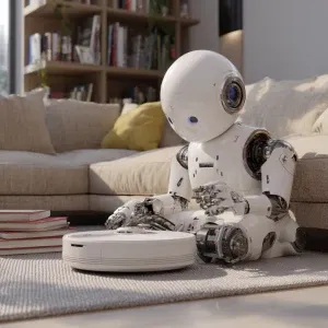 «Sleek anthropomorphic humanoid robot vacumns living room.»