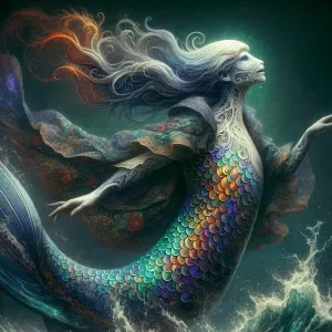 «A shimmering selkie, half-woman, half-seal, dances gracefully in...»