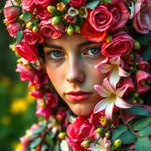 «A close-up portrait of a serene person surrounded by lush greene...»