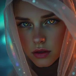 «A surreal close-up portrait of a person draped in a translucent...»