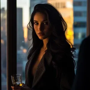 «A cinematic, moody evening scene in a modern high-rise apartment...»