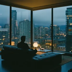 «A cinematic, moody evening scene in a modern high-rise apartment...»