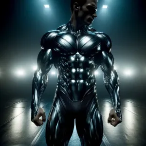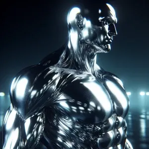«Superman donned in a sleek, reflective liquid metal armor that m...»