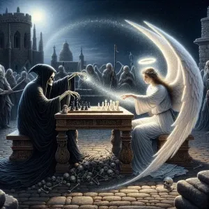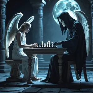«Grim Reaper is sitting at a table playing chess against an ange...»
