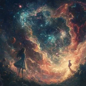 «Create a 2.5D cosmic background featuring a girl alien with cele...»