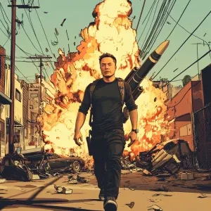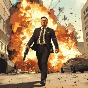 «Elon Musk..Elon walking away from an exploding building holding...»