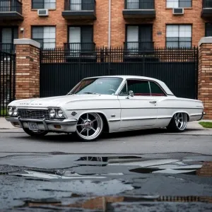 «1963 white Chevrolet Impala, lowrider, spoke rims, brick apartm...»