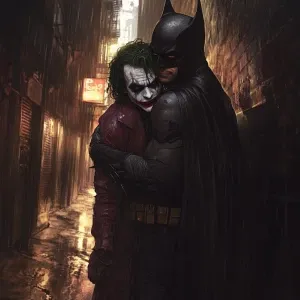 «Heath Ledger Joker, GTA art style,,With Harley Quinn at a fancy...»