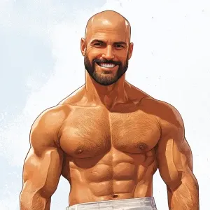 «White muscular thin man with beard, big chin, smile and cheekbon...»
