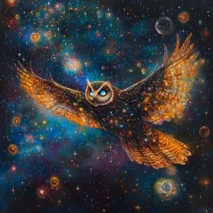 «An ethereal owl soaring through a vast starry sky, its wings dis...»