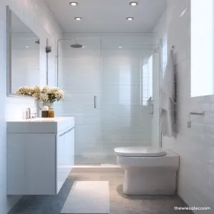 «Create a realistic image of a small modern bathroom in an all-wh...»