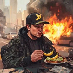 «Elon Musk,Wearing a baseball hat with banana logo on it . Eating...»