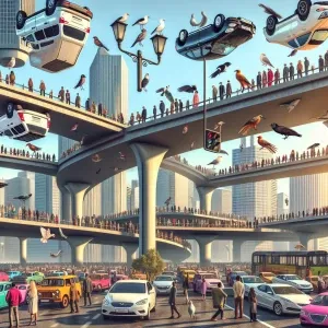 «"Envision a surreal cityscape where cars drive along the sky, bi...»