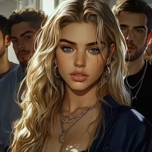 «blonde with blue eyes, clear large oval plump elongated face, bi...»