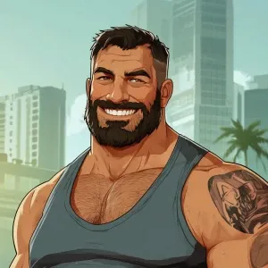 «A muscular man with a big chin and beard who smiles in GTA style»