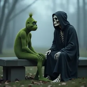 «A realistic photo of a Grinch sitting on a concrete bench next t...»