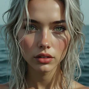 «a striking close-up portrait of a caucasian woman, with wet silv...»