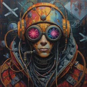 «A vividly rusting hacker in an elaborate dieselpunk attire, each...»