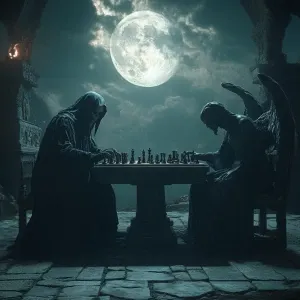 «Grimm Reaper is sitting at a table playing chess against an ang...»