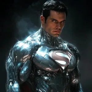 «Superman donned in a sleek, reflective liquid metal armor that m...»