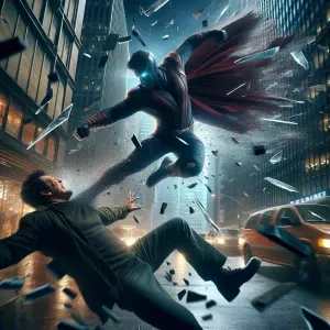«Design a high-definition, cinematic image of a superhero triumph...»