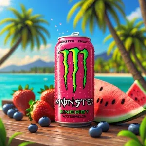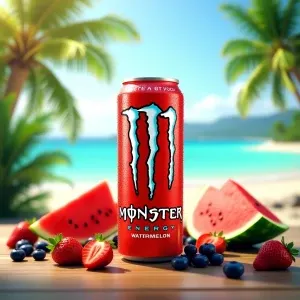 «"A vibrant advertisement-style scene for a can of Monster Energy...»