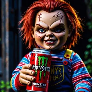 «Chucky, the iconic horror movie doll, clutching an oversized can...»