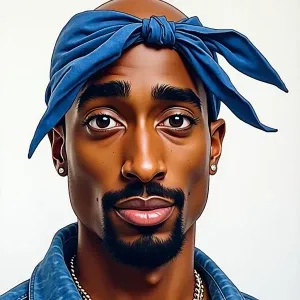 «Create a portrait of the rapper Tupac Shakur (2Pac) showing his...»