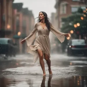 «A barefoot woman in a light beige, sheer, lace-trimmed mini-dres...»