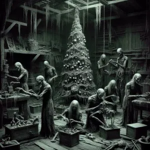 «The elves, with hollow eyes, assemble cursed toys that whir and...»