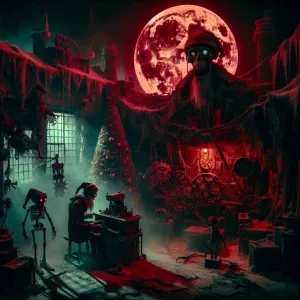 «"Beneath a blood-red moon, a sinister, crumbling Santa's worksho...»