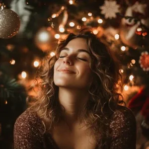 «Image of a woman expressing gratitude amidst a warm, festive Chr...»