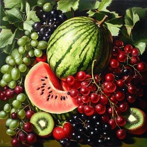 «Create an image featuring vibrant melons, vivid kiwis, lush red...»