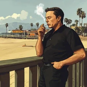 «Elon Musk..leaning on boardwalk railing smoking a cigarette, in...»