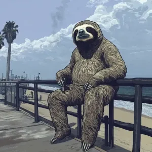 «Sloths slerf meme..leaning on boardwalk railing smoking a cigare...»