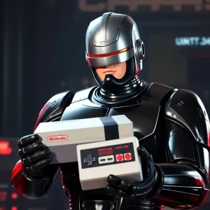«RoboCop holding a classic Nintendo Entertainment System (NES) co...»
