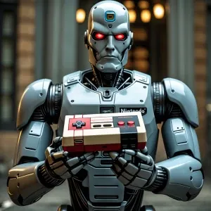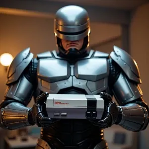 «RoboCop holding a classic Nintendo Entertainment System (NES) co...»