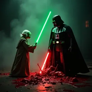 «A striking, dark fantasy cinematic poster featuring yoda wieldin...»