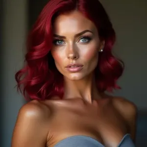 «Portrait of a beautifu Tan l Caucasian woman with Ruby Red Metal...»