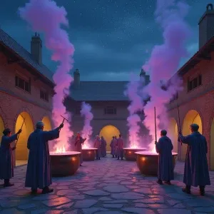 «The Dyers’ Fires Prompt: In an open courtyard, enormous bronze...»