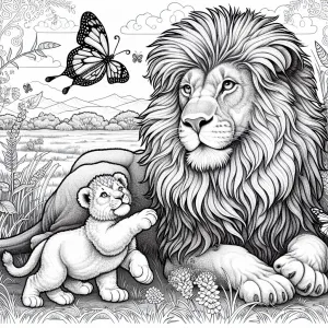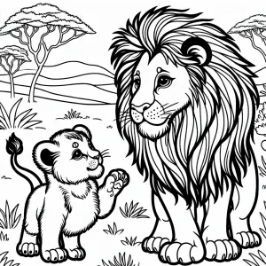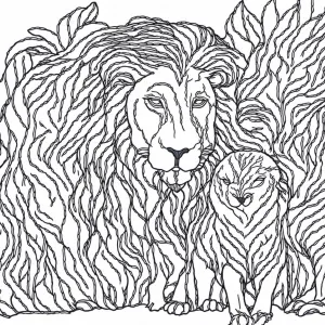 «Create a coloring page design featuring a lion with a cub, suita...»