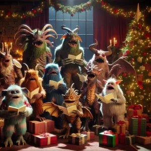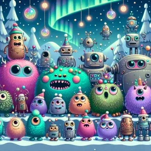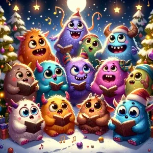 «Cute Monsters and robots singing Christmas carols on Christmas...»