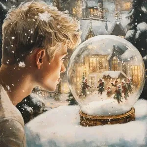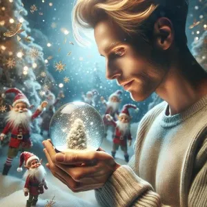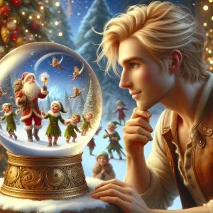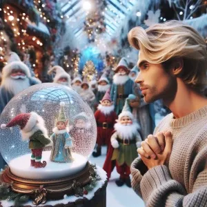 «A whimsical scene depicting a blonde man at the North Pole gazin...»